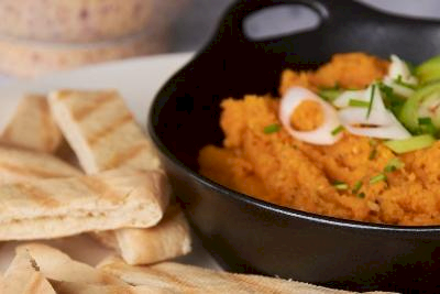 Schep de hummus in een kom, bestrooi met de bieslook en lente-ui. Snij de pitabroodjes in reepjes en serveer bij de hummus.