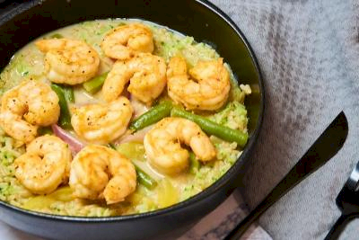 ⠀⠀⠀⠀⠀⠀⠀⠀ - Verdeel de rijstmengeling over de borden samen met de groenten en scampi. Giet de overige kokosmelk over het gerecht.